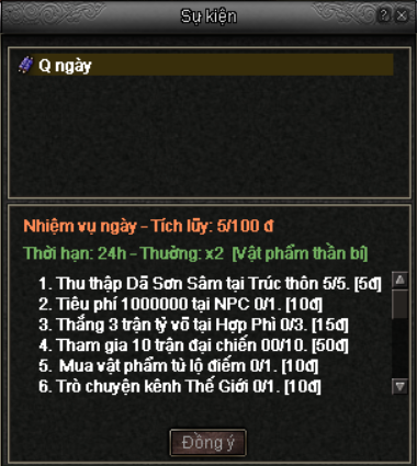 - Nhiệm vụ được reset mỗi ngày, vào lúc server xác định (ví dụ 00:00), nên mỗi ngày bạn có thể làm lại.