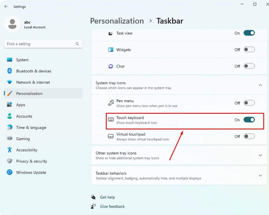 Bước 4. Bây giờ, bạn hãy kích hoạt chuyển đổi cho tính năng Touch keyboard trong phần Taskbar corner icons.