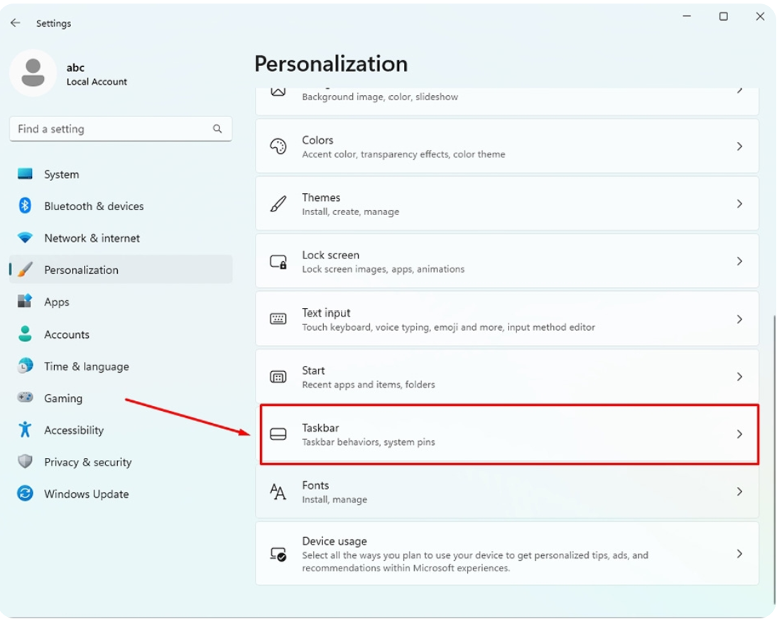 Bước 3. Chọn Taskbar ở ngăn bên phải của cửa sổ ứng dụng.