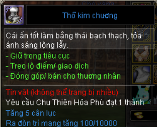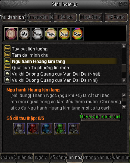Bước 6: Có trong tay 5 bộ Ấn tín nhỏ, nhưng quá tốn chỗ vì chúng ta còn nhiều tín vật khác, vậy hãy nhanh chóng kết hợp 5 cái thành 1 bằng cách vào mục thu thập danh phẩm (giống bước 1), các bạn tìm đến mục Ngũ Hành Hoàng Kim Tàng, sau đó đưa 5 cái ấn nhỏ vào.
