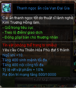 Bước 7: Cuối cùng, khi đã thu thập đủ 5 ấn nhỏ, các bạn quay trở lại Vạn Đại Gia, để đổi Thanh Ngọc Ấn Vạn Đại Gia, và tiếp tục hành tẩu giang hồ.