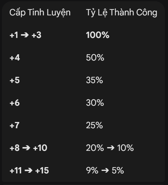 - 🔒 Mốc Thần Thoại (+14 ➔ +21): (Coming Soon -Tỉ lệ sẽ được cập nhật theo từng giai đoạn).