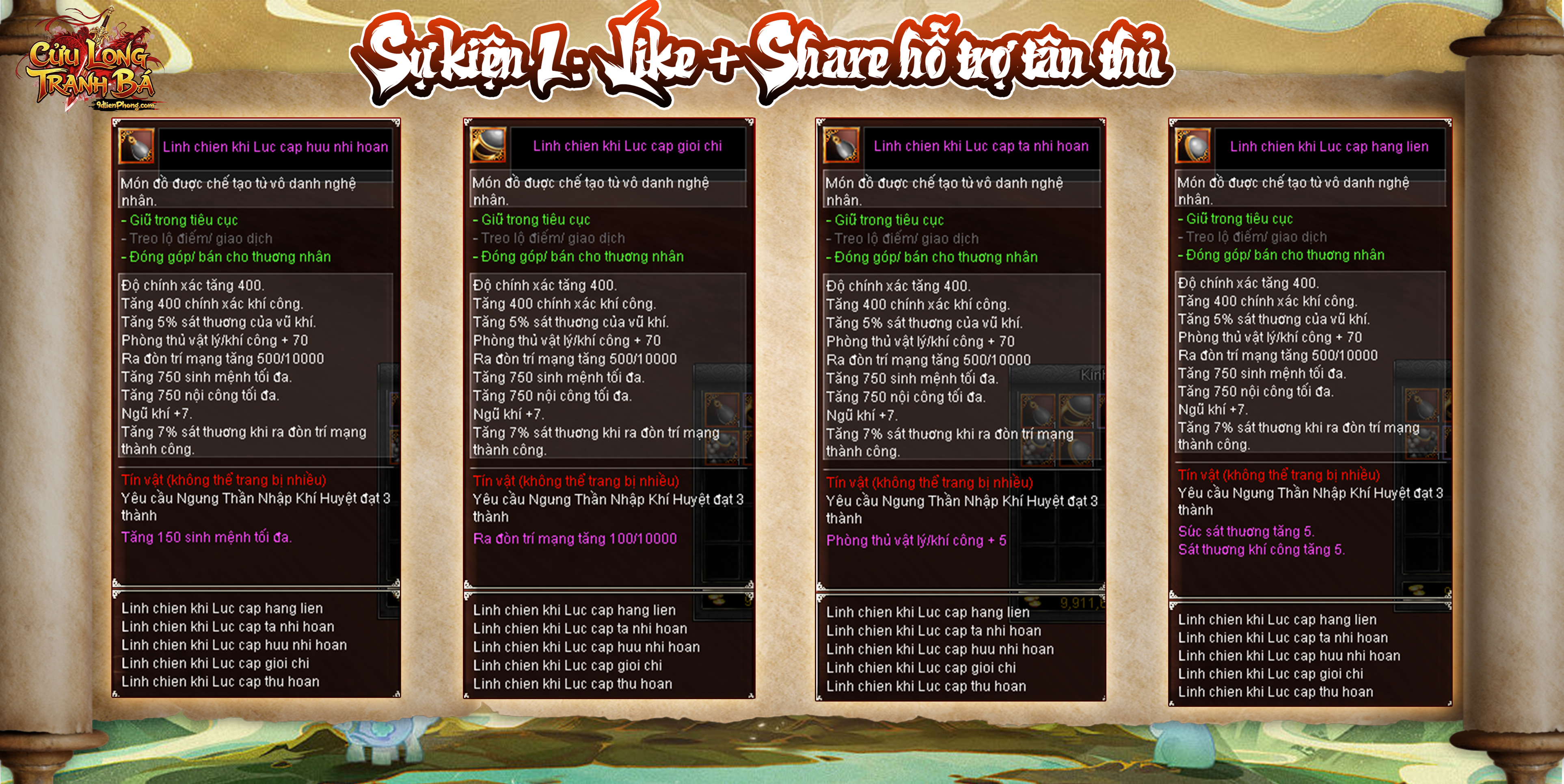 Nhằm hỗ trợ người chơi giai đoạn đầu server và tạo thêm sân chơi tương tác cho cộng đồng, Ban Quản Trị 9D Tiên Phong chính thức mở 02 SỰ KIỆN SONG SONG giúp người chơi hoàn thiện SET TÍN VẬT LINH CHIẾN.